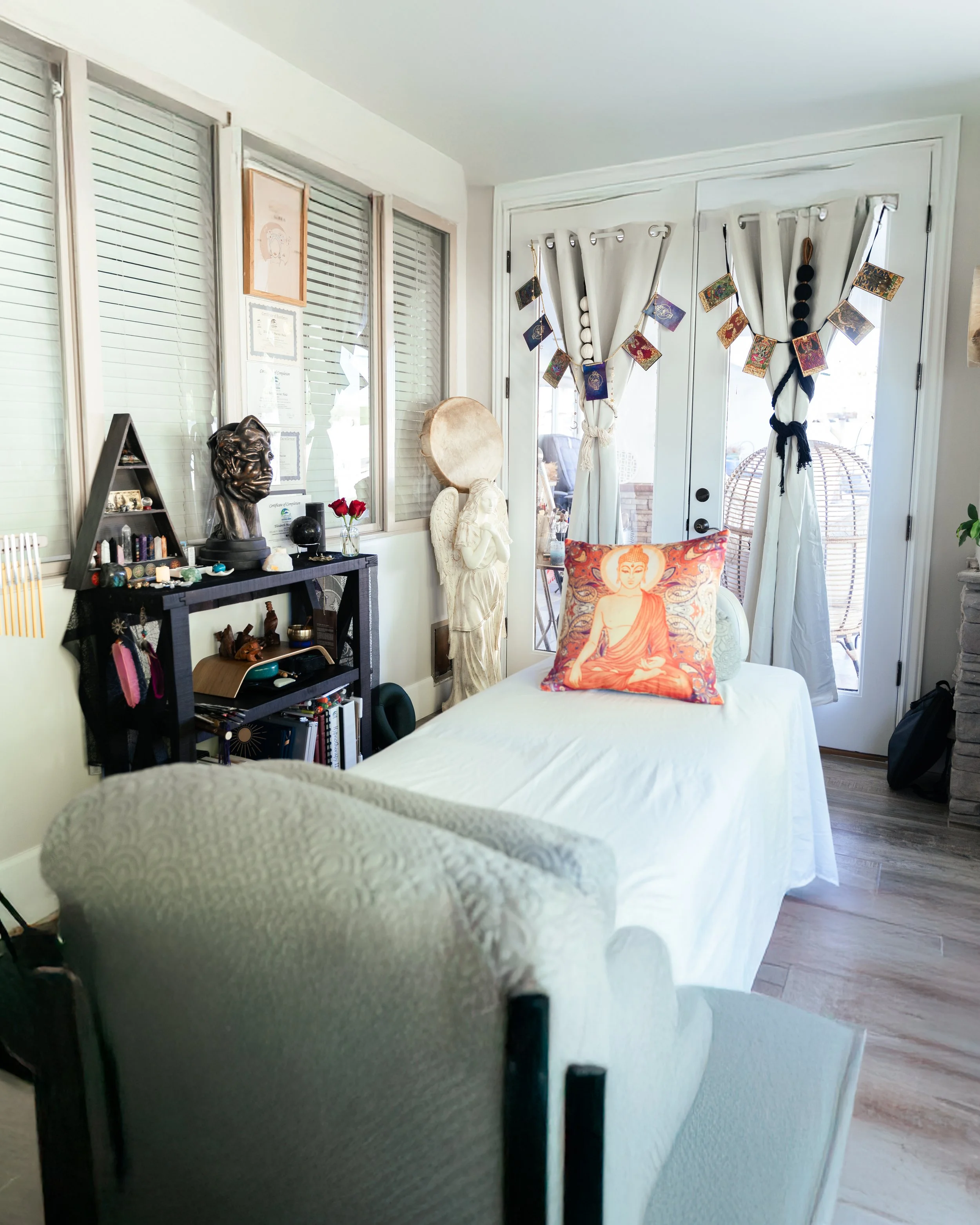 Liz’s treatment room was full of details that reflected her practice, from sacred objects to calming textures and vibrant accents. Photographing the space gives potential clients a sense of what it feels like to step inside and immediately feel at ease.